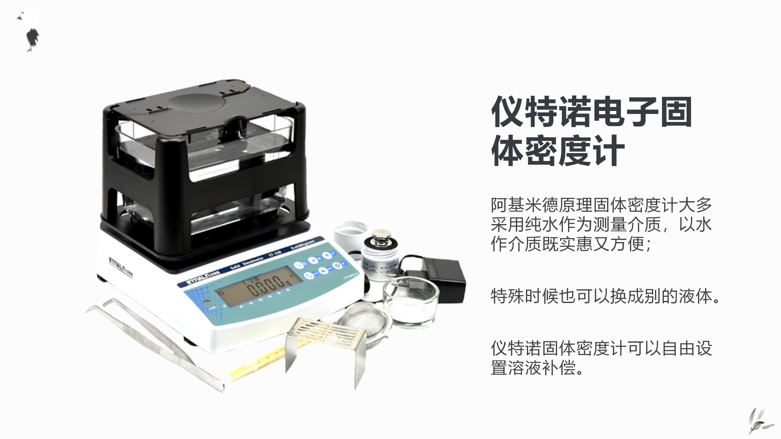 儀特諾固體密度計的其中一個亮點(diǎn)在于,它可以自由設(shè)置溶液補(bǔ)償,更換酒精、硅油等其它介質(zhì)來進(jìn)行測量,這一設(shè)計為要測試的產(chǎn)品會溶于水的用戶提供了極大的便利。