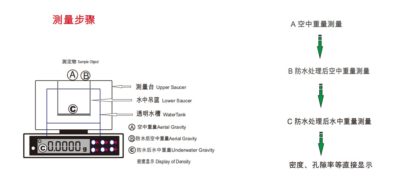 儀特諾密度儀測量三步曲,以ET-320M或ET-120HM為例,測量塊狀、片狀等不規則多孔樣品,就下面簡單的三步: